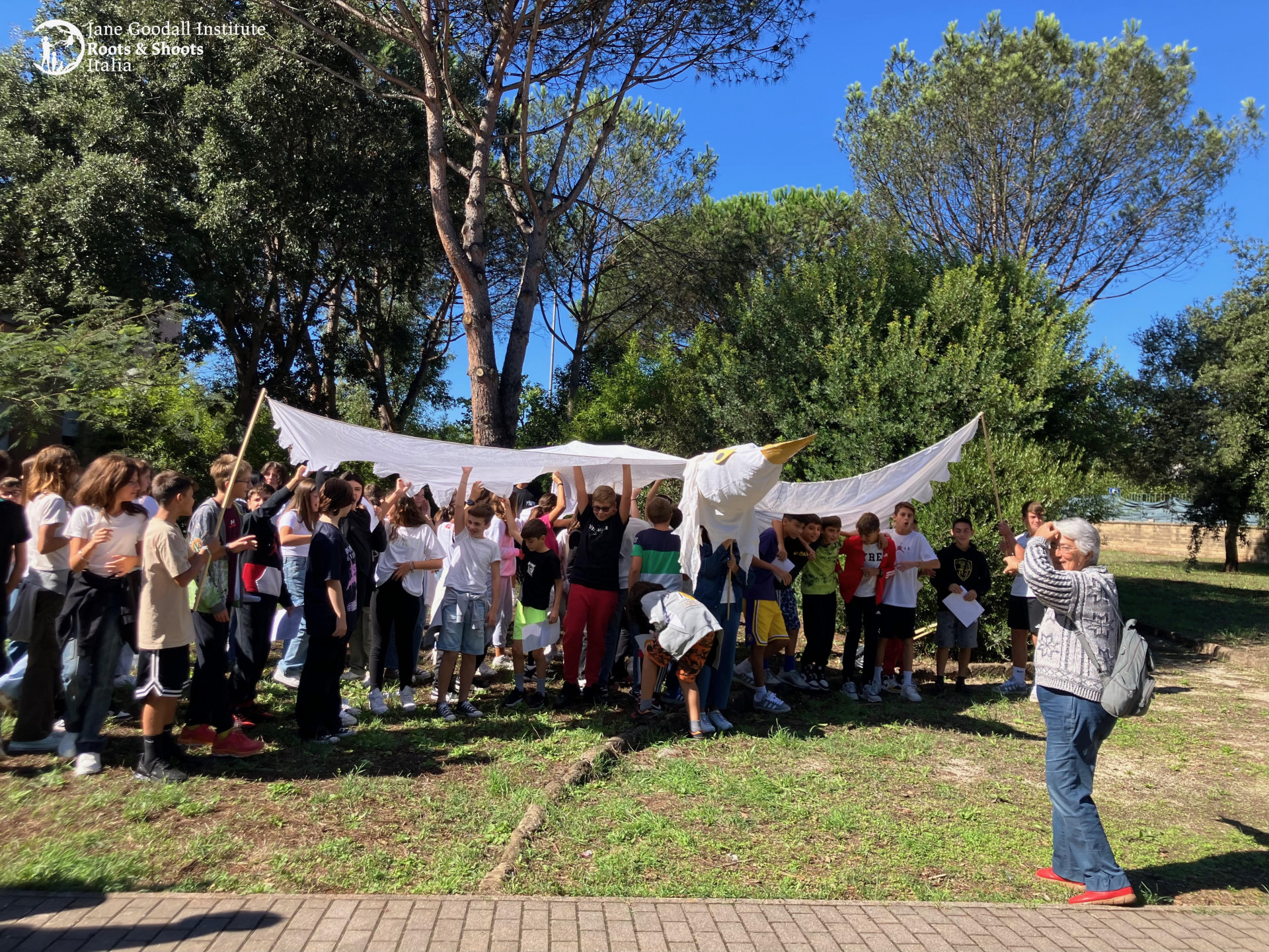 La pace è un bene prezioso, fragile e necessario, che va costruito ogni giorno a partire da noi stessi, nei piccoli gesti, nelle parole, nei rapporti con chi ci è vicino e nella vita della nostra comunità. Con questo spirito, il 20 settembre 2024 gli studenti dell’I.C. “Marta Russo” di Roma, in collaborazione con Jane Goodall Italia, hanno celebrato con entusiasmo la Giornata mondiale della pace. Una giornata intensa e carica di emozioni, in cui le ragazze e i ragazzi hanno dato voce ai propri pensieri attraverso poesie e poemi profondi, cartelloni ricchi di colori, parole e origami a forma di colomba custodi di messaggi di speranza. La pace è risuonata nelle canzoni in inglese, spagnolo e francese, diventando linguaggio universale, mentre una studentessa ha creato uno speciale “scacciaguerre”, ispirato all’acchiappasogni, simbolo di serenità e protezione. La premiazione dei disegni di specie a rischio del contest “Biodiversità da salvare 2024” di Roots & Shoots Action for biodiversity ci ha ricordato che tutto è interconnesso: proteggere la natura significa proteggere noi stessi. Infine, la pace ha preso il volo, portata in alto dalla grande colomba costruita con materiali di recupero, simbolo dal 2002 del JGI per la pace e simbolo concreto di un futuro possibile.