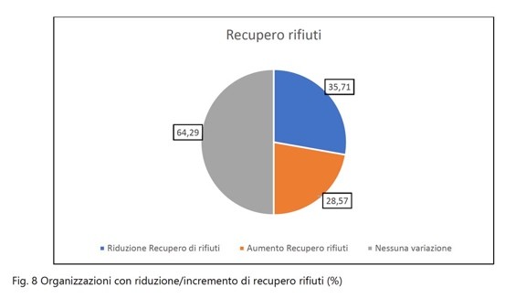 La produzione di rifiuti è monitorata dal 94% delle organizzazioni, ma nel periodo analizzato si registra una lieve prevalenza di aumenti nella quantità di rifiuti prodotti.
