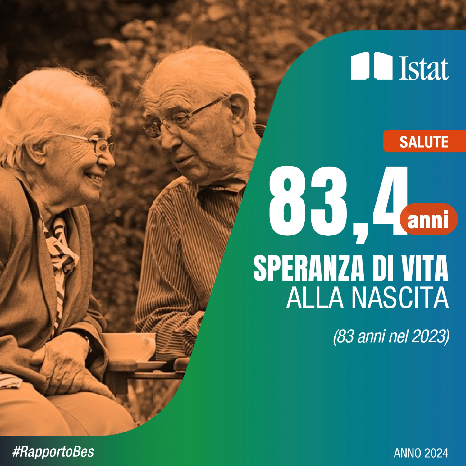 La speranza di vita alla nascita raggiunge 83,4 anni, con un vantaggio di oltre due anni rispetto alla media europea. Cala però la speranza di vita in buona salute, che scende a 58,1 anni, anche a causa del peggioramento della percezione di buona salute (67,1% nel 2024). Le donne registrano un valore più basso (56,6 anni) e un divario di oltre tre anni rispetto agli uomini.
