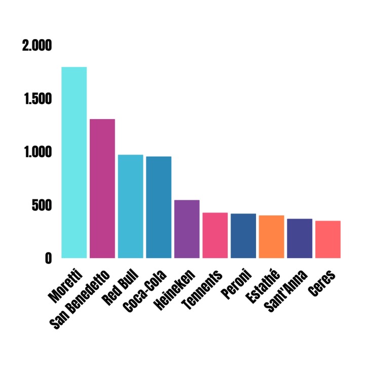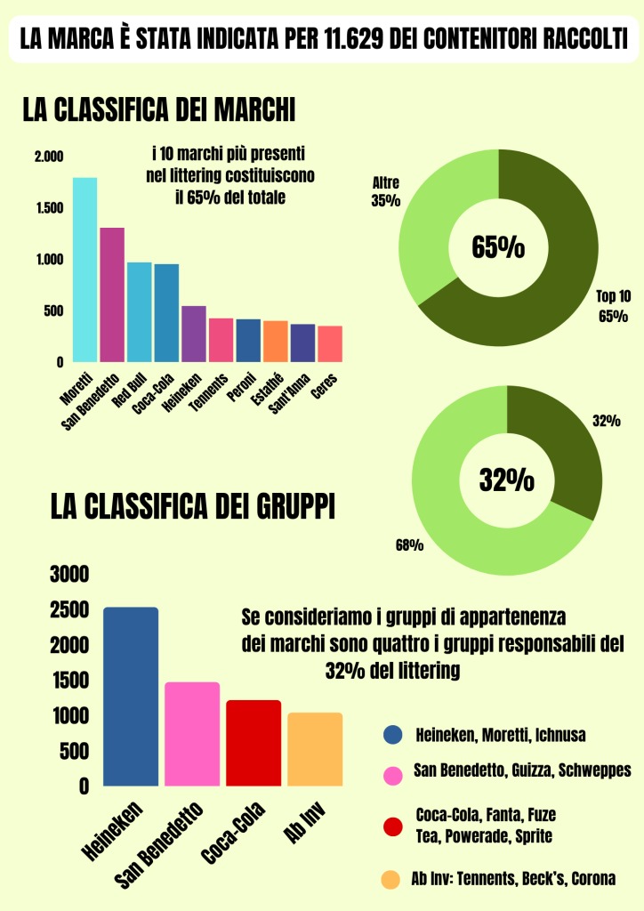 L’indagine evidenzia una relazione significativa tra i marchi più diffusi e i rifiuti rinvenuti. Tra i contenitori per cui è stato possibile identificare la marca, le prime 10 rappresentano il 65% del totale. Tra questi compaiono marchi come Moretti, San Benedetto e Red Bull, mentre tra i gruppi industriali emerge il ruolo di Heineken e Coca-Cola. Il dato non implica una responsabilità diretta dei marchi nella dispersione, ma segnala un legame tra volumi di mercato e presenza nei rifiuti. Un elemento che richiama il principio europeo della responsabilità estesa del produttore. Il documento evidenzia anche come il dibattito pubblico abbia spesso attribuito il littering ai comportamenti individuali, mentre i dati suggeriscono la necessità di intervenire anche a monte, sui sistemi di gestione e restituzione degli imballaggi.