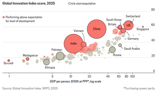 L'ingresso della Cina nella top ten è ancora più sorprendente se si considera il suo status di economia a medio reddito. Fino a qualche decennio fa, nell’immaginario collettivo si pensava al “Dragone celeste” come al Paese “che sa solo copiare bene”, evidenzia lo studio. Tuttavia, nel 2024 il Paese del Sol Levante ha scalzato la Germania. I suoi punteggi per gli output, ovvero brevetti, marchi, esportazioni e simili, sono stati migliori del previsto, considerando il livello degli input, cioè istruzione, spesa per la ricerca e così via. L’Italia è 28esima.