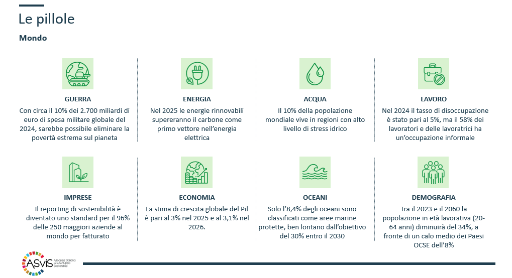 Quest’anno, più di ogni altro trascorso finora, il Rapporto fotografa un mondo attraversato da crisi multiple e da un preoccupante arretramento sul piano della pace, della giustizia e della tutela dei diritti. L’instabilità geopolitica e i conflitti armati – sono 59 quelli attivi nel mondo, il numero più alto dalla fine della Seconda guerra mondiale – hanno causato quasi 50mila vittime civili nel 2024. In questo tragico conteggio, il numero di decessi di bambine, bambini e donne nel biennio 2023-2024 (soprattutto a Gaza) è aumentato di circa quattro volte rispetto al periodo precedente. La spesa militare globale ha raggiunto il livello record di 2.700 miliardi di dollari e potrebbe più che raddoppiare entro il 2035. Il numero di persone sfollate contro la propria volontà ha superato i 123 milioni, aumentando del doppio in dieci anni, per effetto di guerre e cambiamenti climatici. È per questo motivo che, si legge nel Rapporto, è stato deciso di richiamare nel titolo questi temi, per “ricordare che la pace, la democrazia e la tutela dei diritti sono pilastri dello sviluppo sostenibile”.