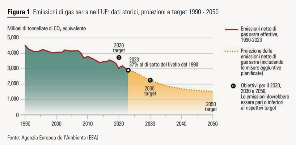 Dal 1990 al 2024, le emissioni di gas serra in Italia sono diminuite del 28%, ma il taglio del solo 2024 è stato solo del 2%, quattro volte inferiore rispetto al 2023. Per rispettare l’obiettivo del -43% al 2030, servirà un’ulteriore riduzione del 15% nei prossimi sei anni.