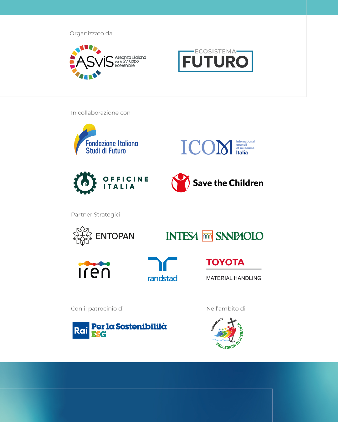 In occasione dell'Anno giubilare della speranza e della Giornata mondiale dei futuri promossa dall’Unesco, il 2 dicembre, presso l'Auditorium dell'Ara Pacis (Via di Ripetta 190) a Roma, si è tenuto l'evento "Un patto sul futuro, anche nell’interesse delle future generazioni". Organizzata dall'ASviS, in collaborazione con Icom Italia, Officine Italia, Save The Children e Fondazione Italiana per gli Studi sul Futuro, nell'ambito dell’iniziativa Ecosistema Futuro che è stata presentata per l'occasione, la giornata nasce con l'obiettivo di posizionare a livello istituzionale e mediatico il tema del futuro, o meglio, dei futuri possibili.