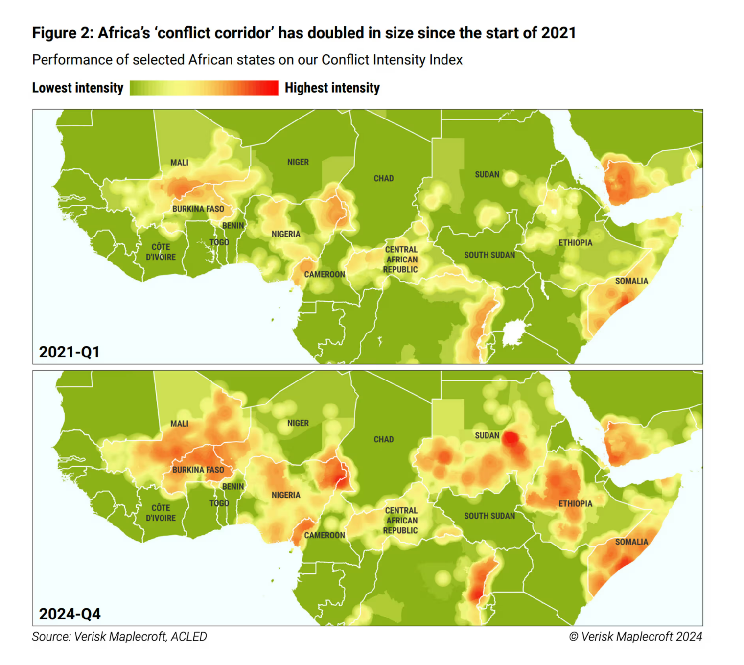L’Africa subsahariana, inoltre, continua a essere la regione più colpita dai conflitti armati: secondo l’Armed conflict survey 2024 dell’International institute for strategic studies, nel 2023 14 Paesi dell’area su 49 erano in guerra e sono stati registrati 28 conflitti interni, il numero più alto dal 1991. Il rapporto “Conflict intensity index” ha individuato un “corridoio dei conflitti” che si estende dal Sahel al Corno d’Africa, dove gli episodi di violenza sono raddoppiati negli ultimi tre anni. I conflitti e l’instabilità politica sono sfruttati da gruppi terroristici che, anche attraverso attacchi terroristici e radicalizzazione, stanno consolidando il loro potere.