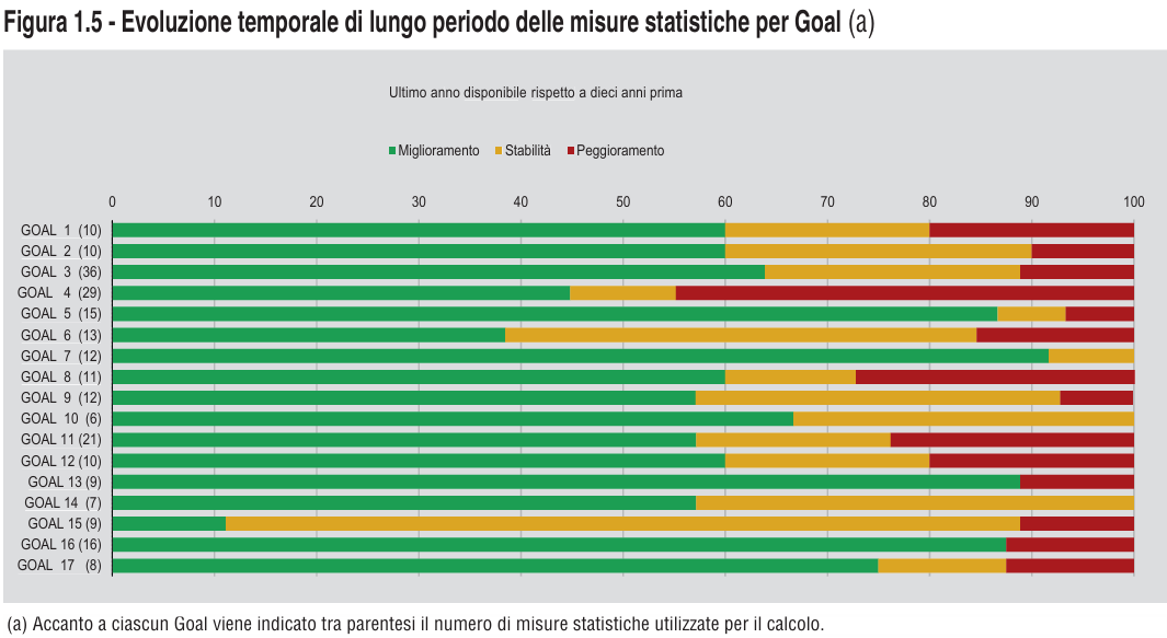 Nel confronto decennale, 14 Goal su 17 vedono almeno la metà delle misure in progresso. Tuttavia, anche su questo orizzonte, i Goal 15 e 6 restano caratterizzati da inerzia o peggioramento, così come il Goal 4 (Istruzione), che presenta oltre il 40% di misure in peggioramento.