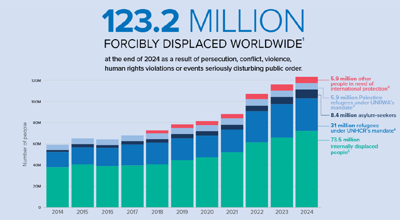 Alla fine del 2024, 73,5 milioni di persone risultavano ancora sfollate a causa di conflitti e violenze, ovvero un 9% in più rispetto al 2023. Si stima che con 11,6 milioni di persone sfollate all'interno dei propri confini (+2,5 milioni rispetto al 2023), la crisi in Sudan rimanga, sotto questo profilo, la più grande mai registrata.