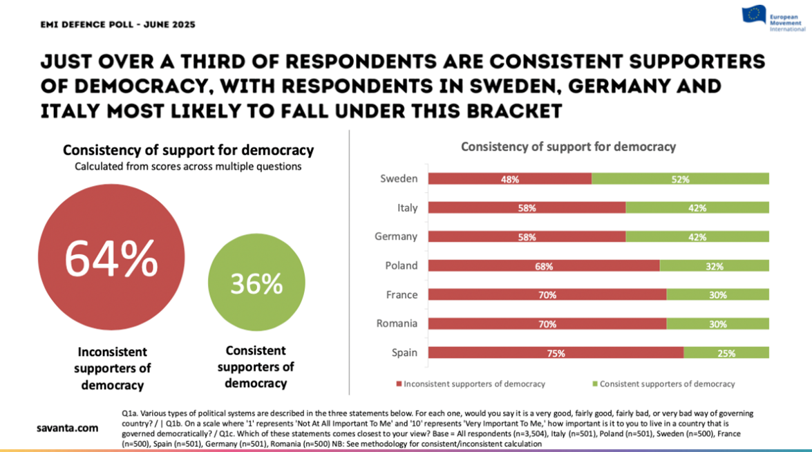 Solo il 36% dei rispondenti al sondaggio di European movement international vede positivamente la forma di governo democratica, mentre cresce il sentimento nazionalista, anche se si afferma l’idea di un esercito comune. 22/8/25