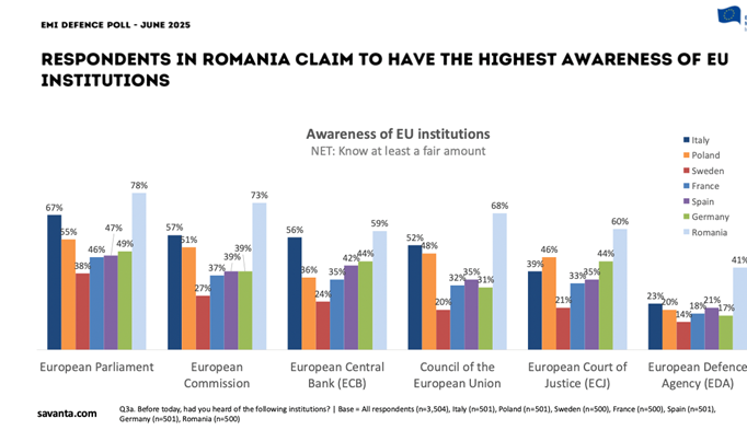 In generale, l’Ue è l’istituzione internazionale più conosciuta dagli europei (rispetto a Nazioni unite, Nato, e G20): il 61% dei rispondenti afferma di “sapere qualcosa” o di “saperne molto”. I due Paesi dove la consapevolezza rispetto alla Ue è più alta sono la Romania (76%) e l’Italia (72%), ma in tutti i Paesi il dato supera il 50%.