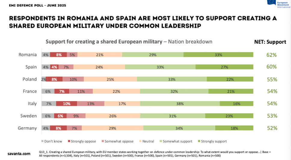 In linea con queste risposte, il 56% dei partecipanti al sondaggio è d’accordo “in parte” o “molto” con la proposta di creare un esercito europeo comune, dove gli Stati membri lavorano insieme sotto una leadership di difesa comune. A essere maggiormente d’accordo con questa affermazione sono rumeni (62%) e spagnoli (60%), mentre in Italia questa proposta è condivisa dal 54% degli intervistati.