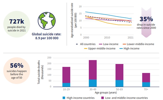 L’Oms evidenzia come il suicidio resti una delle principali cause di morte tra i giovani, con 727mila vittime nel 2021. Nonostante gli sforzi globali, il tasso di mortalità non diminuisce abbastanza per rispettare l’Obiettivo di sviluppo sostenibile che punta a ridurre di un terzo i suicidi entro il 2030: con l’attuale trend si arriverà solo a un calo del 12%.