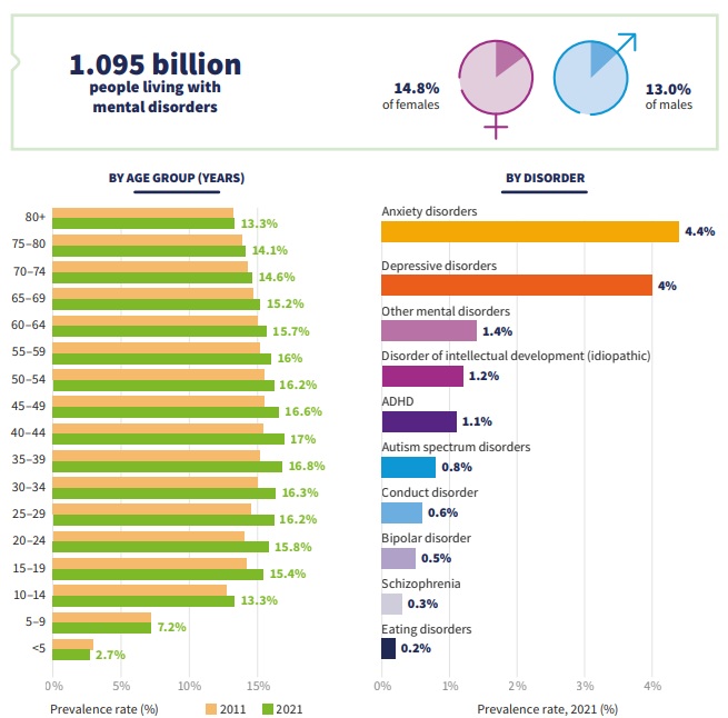 “Investire nella salute mentale significa investire nelle persone, nelle comunità e nelle economie”. Con queste parole, Tedros Adhanom Ghebreyesus, direttore generale dell’Oms sottolinea la responsabilità dei governi nel trattare la salute mentale non come un privilegio ma come un diritto fondamentale. Secondo due nuovi Rapporti dell’Organizzazione mondiale della sanità (Oms), World mental health today e Mental Health Atlas 2024, oltre un miliardo di persone nel mondo convive con disturbi mentali come ansia e depressione. Si tratta della seconda causa di disabilità di lungo periodo e di una delle principali voci di perdita di anni di vita in buona salute. Le ricadute non sono solo sanitarie ma anche economiche: ansia e depressione generano ogni anno circa mille miliardi di dollari di costi per l’economia globale, soprattutto in termini di perdita di produttività.