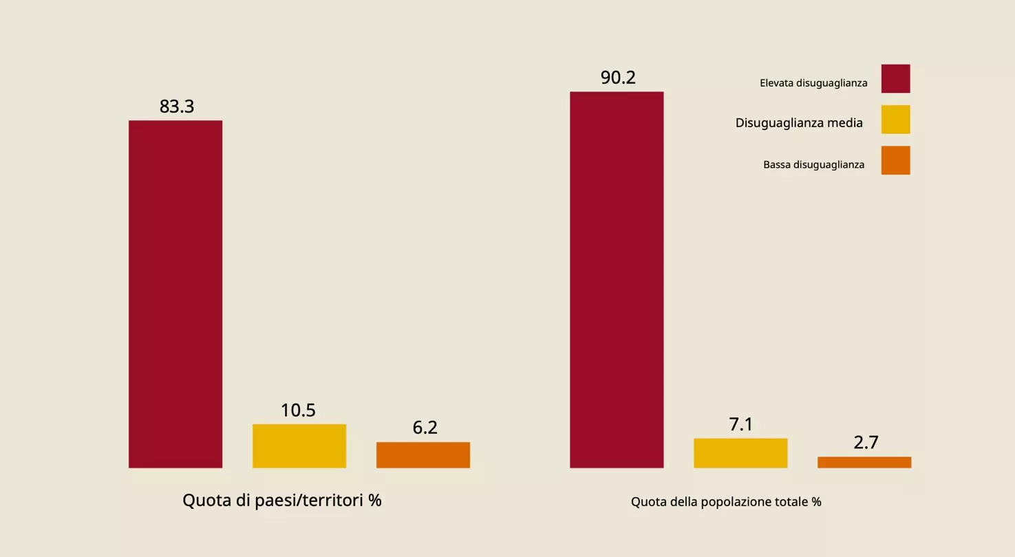 La disuguaglianza nelle condizioni di vita delle persone è oggi estremamente ampia. Il divario tra ricchi e poveri nel mondo continua ad allargarsi. I miliardari, che secondo Oxfam sono meno di 2.800, sono più ricchi che mai. Insieme, ora possiedono una ricchezza netta complessiva di oltre 15mila miliardi di dollari. Se fossero un Paese, sarebbero il terzo più ricco del pianeta, subito dopo Stati Uniti e Cina. In fondo alla piramide, invece, i cittadini dei Paesi a basso e medio reddito faticano ad accedere a sanità, istruzione e altri servizi pubblici essenziali.