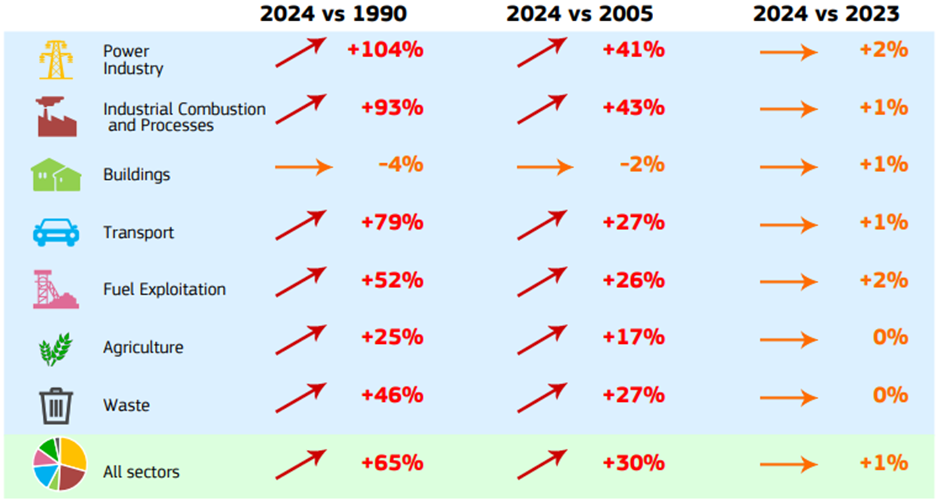 Il Rapporto evidenzia come nel 2024 l’aumento delle emissioni sia stato trainato dal settore energetico, che ha fatto registrare la crescita più consistente in termini assoluti: 235 milioni di tonnellate di CO₂ equivalente in più rispetto all’anno precedente. Si tratta di un incremento legato in larga parte alla maggiore domanda di energia e al persistente ricorso ai combustibili fossili, che da soli segnano anche l’aumento relativo più elevato, pari all’1,6%.