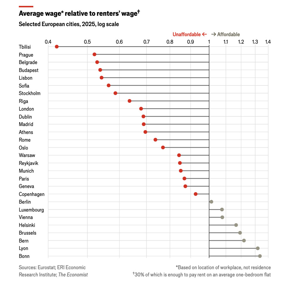 Secondo il Carrie bradshaw index dell’Economist, in quasi tutte le città europee un reddito medio non basta per sostenere un affitto. L’Italia fa eccezione solo in parte, mentre il divario tra affitti e salari cresce. 10/02/26