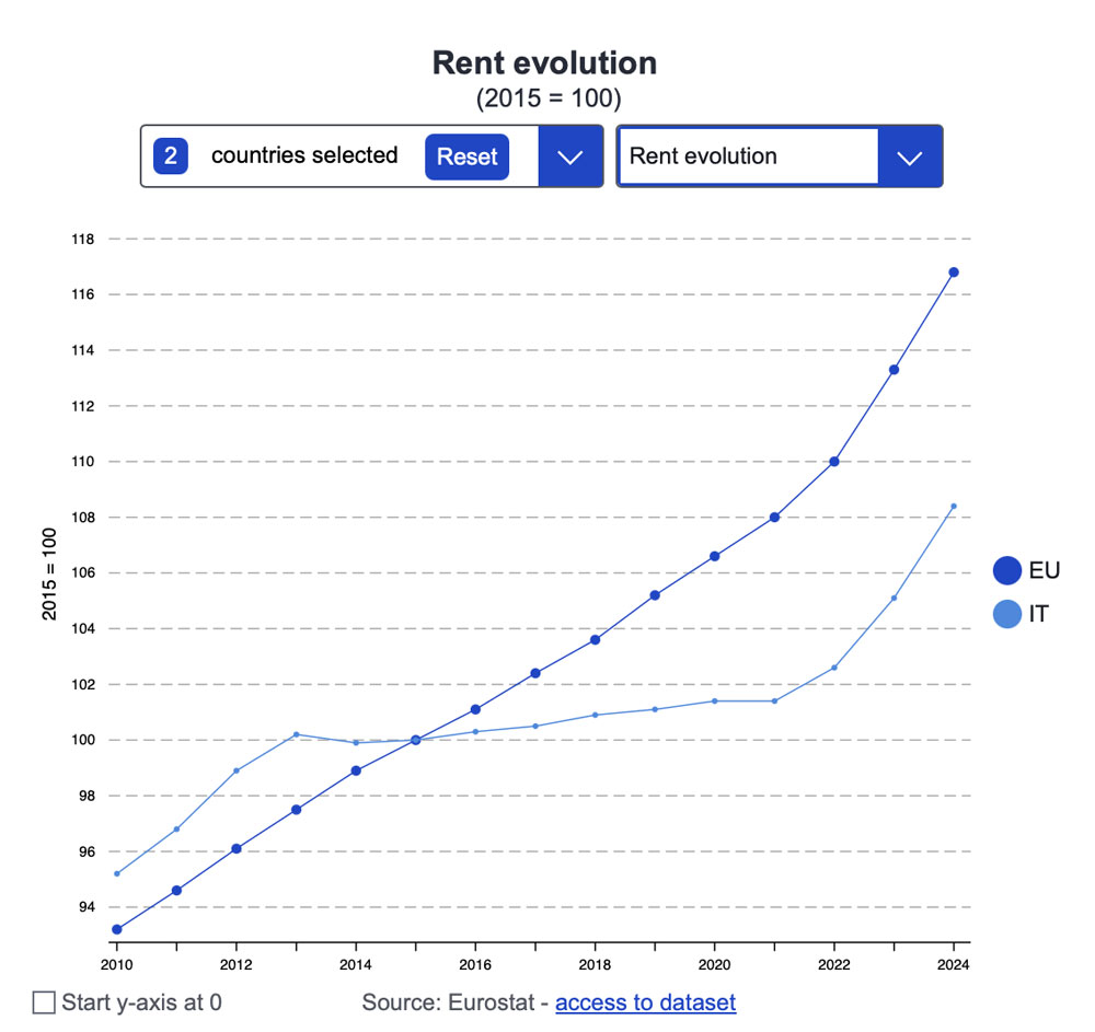 Il confronto europeo assume contorni particolari se si guarda all’Italia. Secondo il report Housing in Europe 2025 di Eurostat, tra il 2010 e il 2024 i prezzi delle abitazioni sono aumentati del 53% nell’Ue, ma non in Italia, che insieme a Cipro è l’unico Paese a registrare una riduzione complessiva dei prezzi di acquisto.