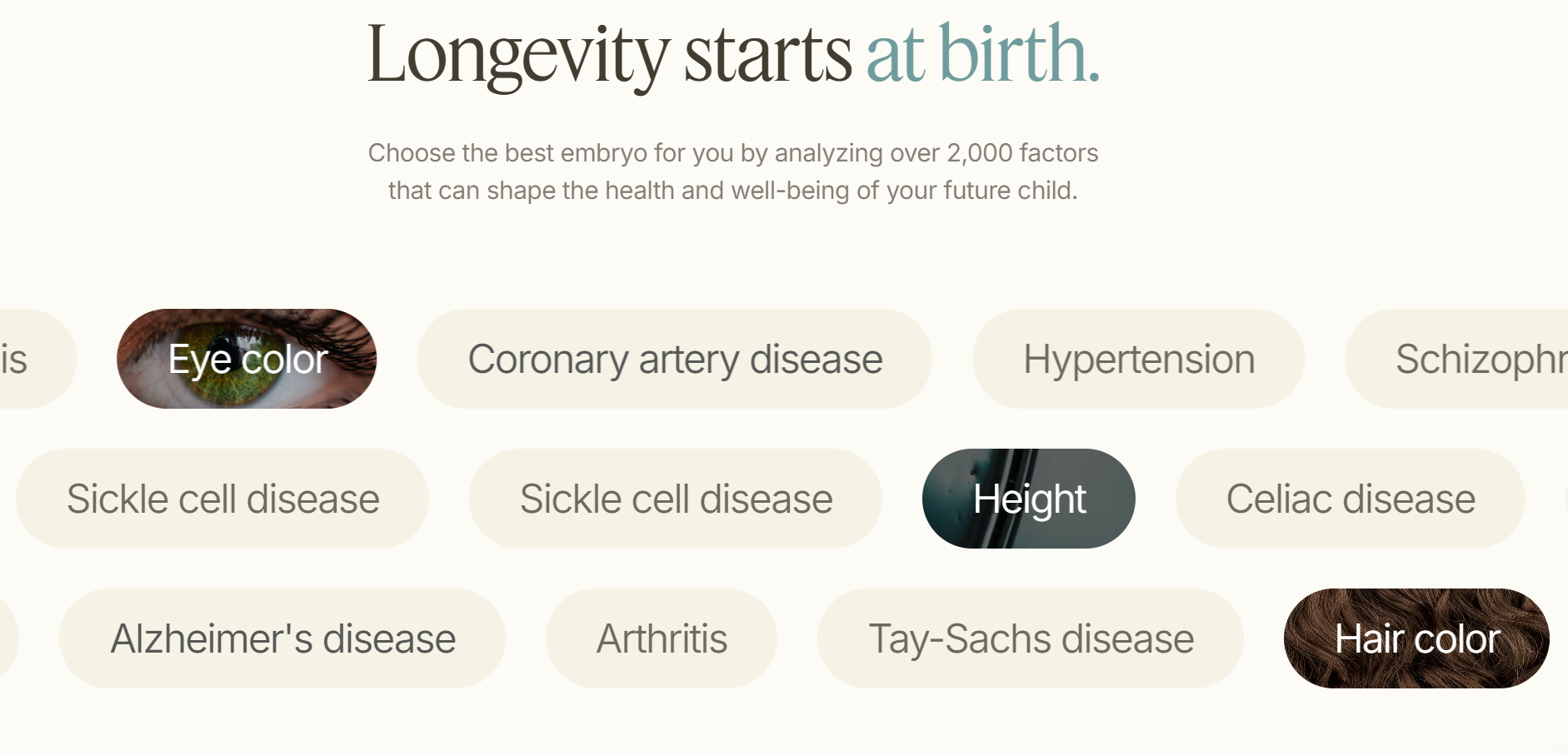 La startup Heliospect genomics sostiene di poter selezionare, tra cento embrioni, i dieci più intelligenti così da assicurare un quoziente intellettivo di sei punti maggiore rispetto a un embrione concepito naturalmente. Nucleus embryo si spinge anche oltre: “Scegli il miglior embrione per te attraverso l’analisi di oltre 2mila fattori che possono influenzare la salute e il benessere del tuo futuro figlio” si legge sul sito dell’azienda. La lista è lunga: ipertensione arteriosa, fibrosi cistica, diabete mellito di tipo 2, ma anche colore degli occhi e dei capelli, altezza o propensione alla calvizie.