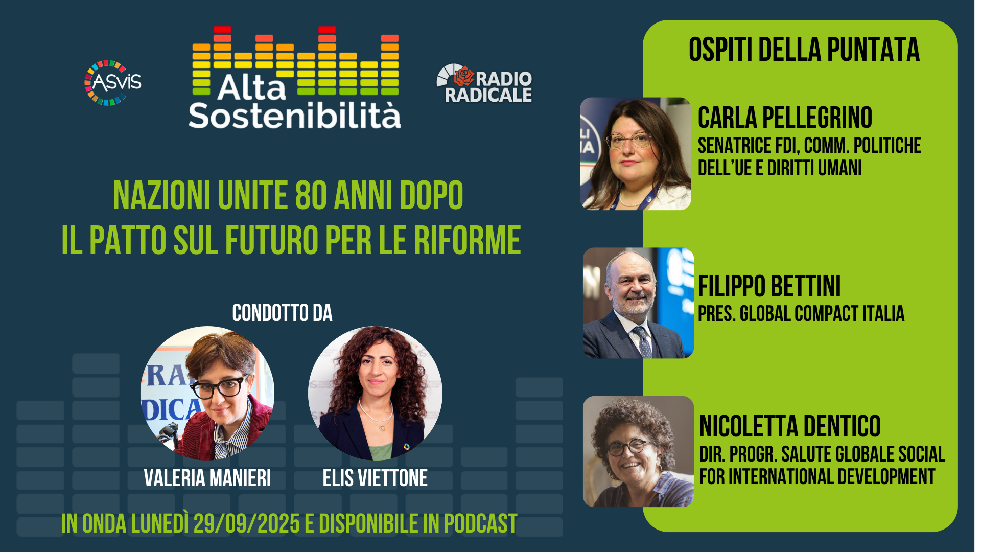 Ad Alta sostenibilità, in onda lunedì 29 settembre alle 12.30 e disponibile in podcast. Ospiti della puntata: Cinzia Pellegrino, senatrice Fratelli d’Italia e componente della commissione politiche europee e diritti umani, Filippo Bettini, presidente del Global Compact Italia delle Nazioni Unite e Nicoletta Dentico, direttrice del programma Global Health della Society for International Development. Conducono Valeria Manieri ed Elis Viettone.